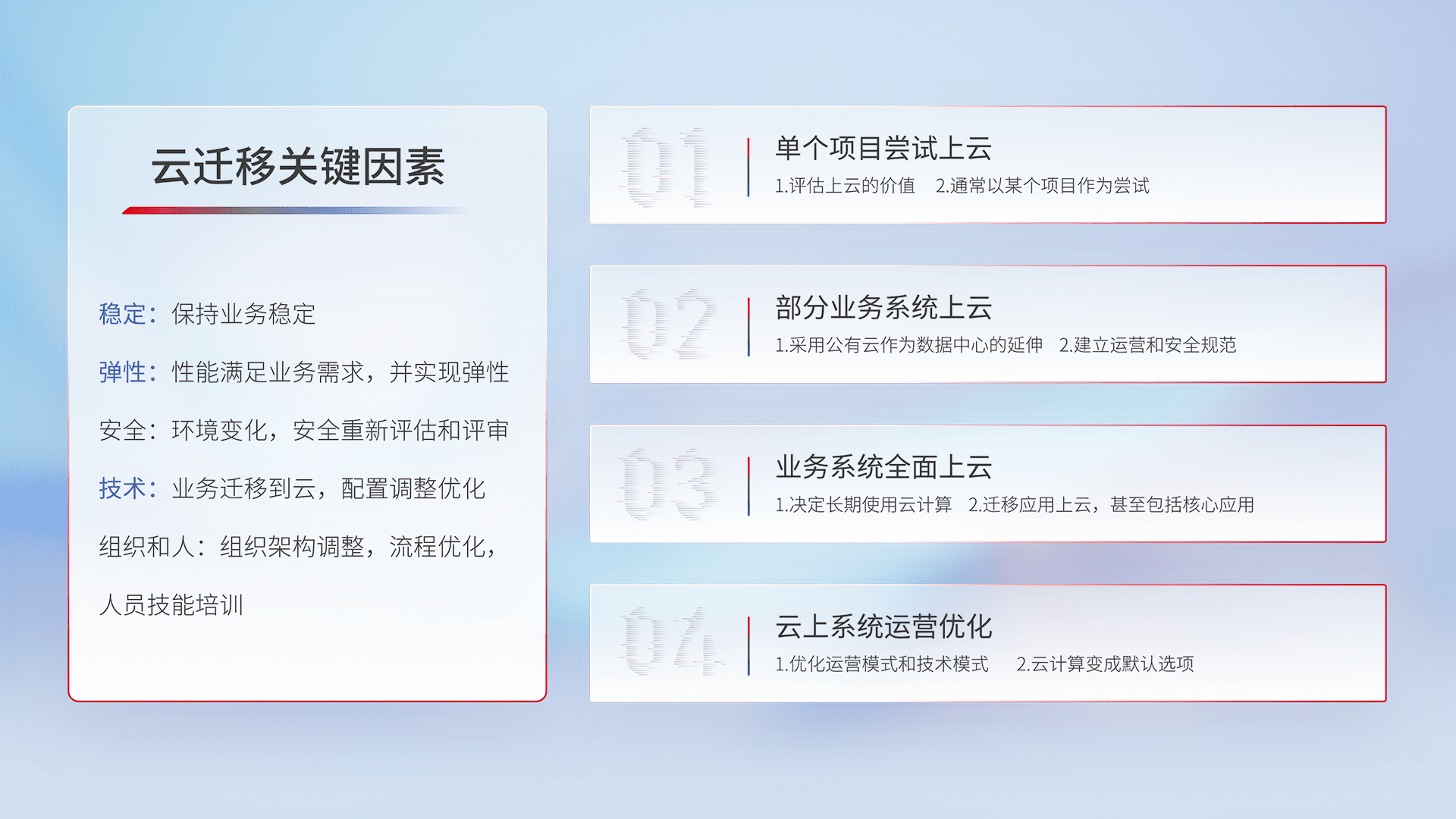结合实际业务,,,从规划设计、、、、云平台选型、、、云原生改造、、、、数据迁移、、集成交付,,迁移全过程为客户识别最佳上云路径,,,做好风险识别管理,,设计网络架构、、、、身份权限、、安全审计合规、、、操作审计、、、日志审计、、、、监控告警策略、、、多站点容灾设计等,,对云上基础设施进行整体规划,,,提升IT治理水平,,以满足弹性、、、、高可用、、、高性能的需求。。。