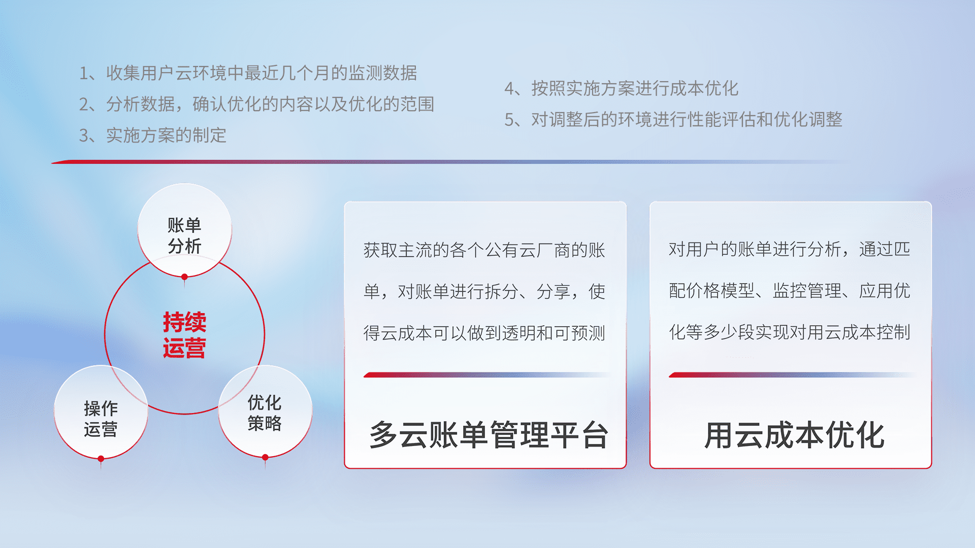 通过多云纳管,,以统一的资源数据模型把客户的云资源进行抽象和封装,,,进而实现对多云资源的统一操作,,,保障云资源管理的可靠性、、、、稳定性与可用性。。量身定制化运维内容,,,配置、、、、开发运维、、补丁管理、、备份、、、、监控、、、、认证和访问管理、、、、审计和日常巡检等,,保障在用云过程中的可靠度,,,稳定度以及高可用率。。。。